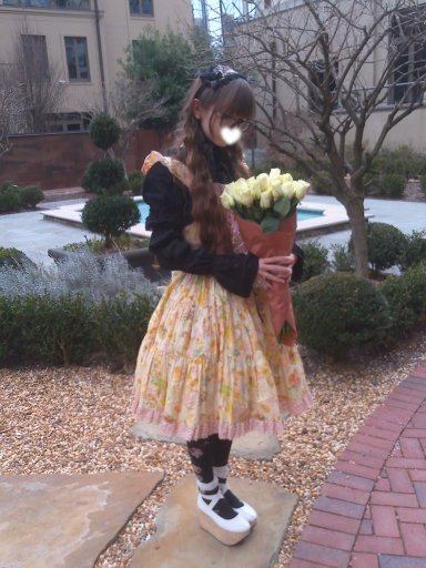 my coordinate was inspired by him ! he's associated with angels and also the colour black , so i paired my innocent world angel print JSK with my black wirehead frill collar blouse ! -- i also opted for a floral wirehead headdress & floral baby socks to compliment the print and also tie in our floral interests with the valentine's day theme !